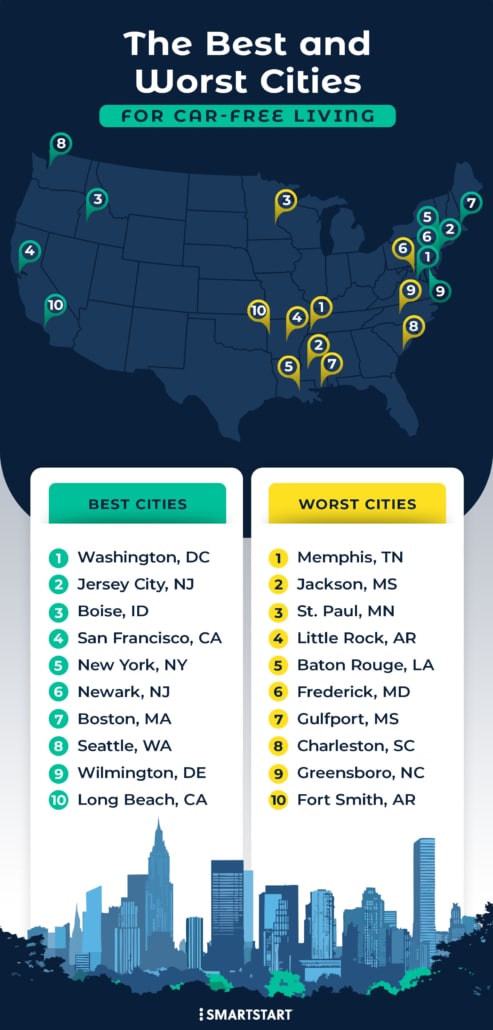 - Memphis, TN; Jackson, MS; and St. Paul, MN are the worst cities in the US for those trying to live car-free.